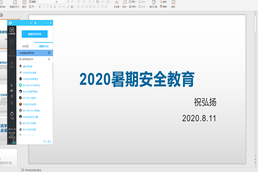 8月11日8点30由思想导师祝弘扬主持的班会在腾讯课堂召开,围绕“暑假安全教育”为主题。全体会计19级同学参加。思想导师祝弘扬针对假期易发生事故做了安全教育和就离校前各个事项准备做了详细安排。