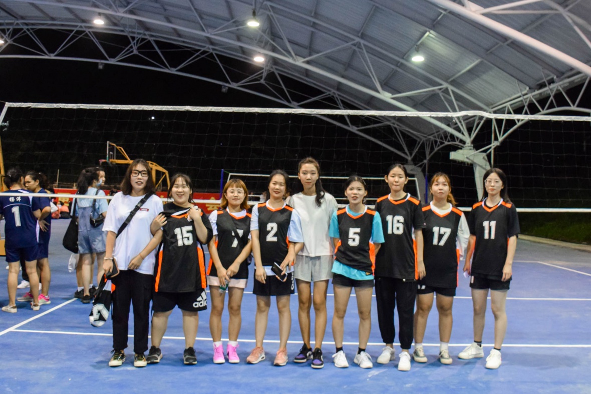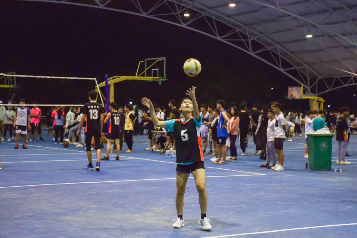 比赛开始之前,双方运动员们都在活力满满地进行着赛前热身运动,蓄势待发。随着裁判的一声哨响,排球脱手而出,在空中划出一道优美的弧线,随之而来的双方观众的加油与呐喊。双方运动员的眼神死死盯着空中的排球,不让它有落地的机会。随着双方运动员的传球,运球,排球在两边来回传递,财经学院一直领先于音乐学院,最后财经学院以25:13拿下第一场的胜利。