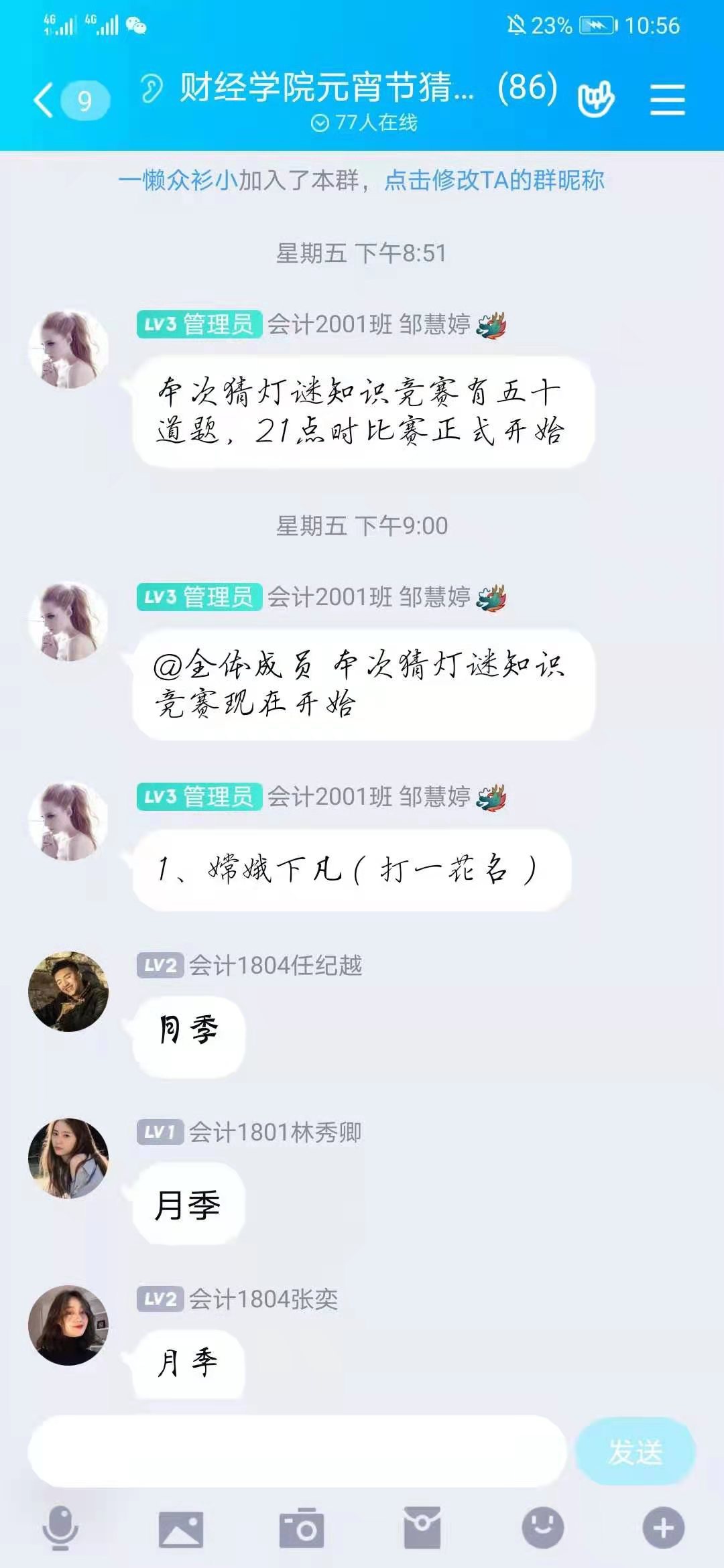 本次线上猜灯谜比赛会将提出若干题,采取QQ群抢答的方式,每道题中第一个回答正确的人会发放奖励,比赛开始后,每发完一道题,有一分钟的时间作答,一人六组灯谜,猜对一个记一分,猜对两个记四分,每答错一个扣两分。第一个回答正确的人将会由后台工作人员记录,以便后续能正常发放奖励。