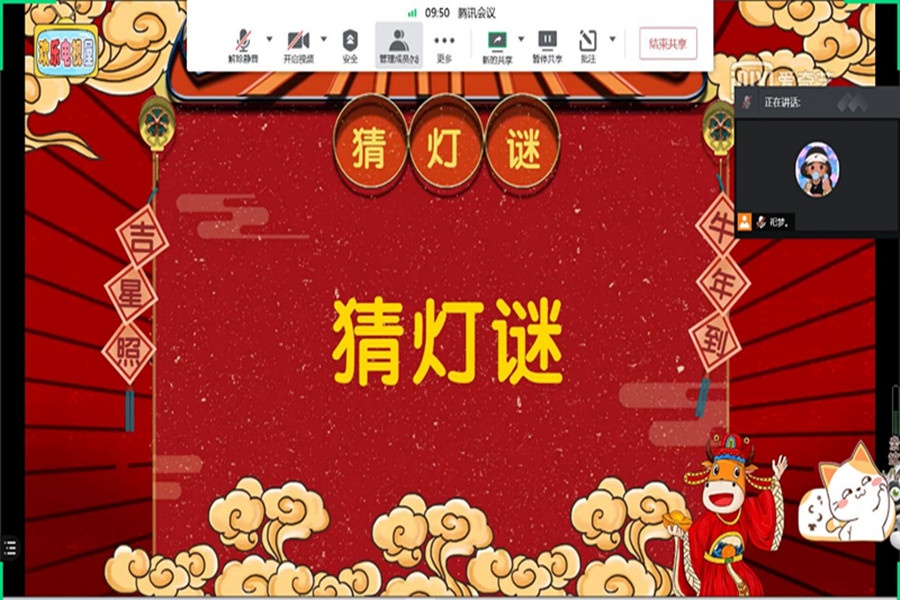 最后是元宵节必不可少的活动——猜灯谜,伴随着喜庆的背景音乐,同学们的踊跃回答,让会议充满热闹气氛。