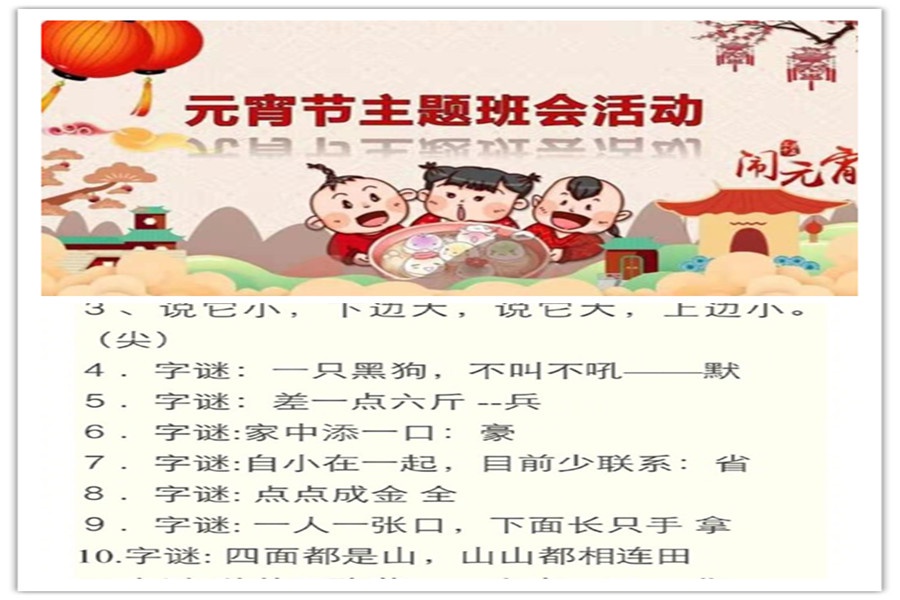 元宵节是我国的首要传统节日,是进行革命传统教育和传统良好教育的大好时机。我班在元宵节来临之际,开展了许多丰富多彩的节日活动:由班长给同学们晓畅元宵节的由来,讲解元宵节的习俗以及猜灯谜。树立了民族文化之根,让同学们切身体会到中华民族文化的魅力所在。