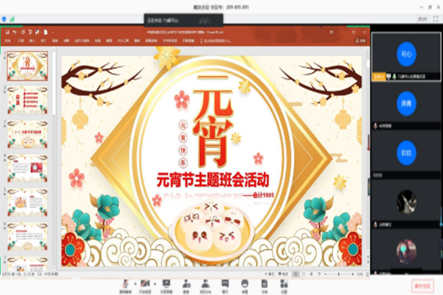 十五月亮初月圆,阖家欢聚人更圆。为了让同学们在校期间可以度过一个难忘的元宵节,会计1905班举行了线上主题班会活动。