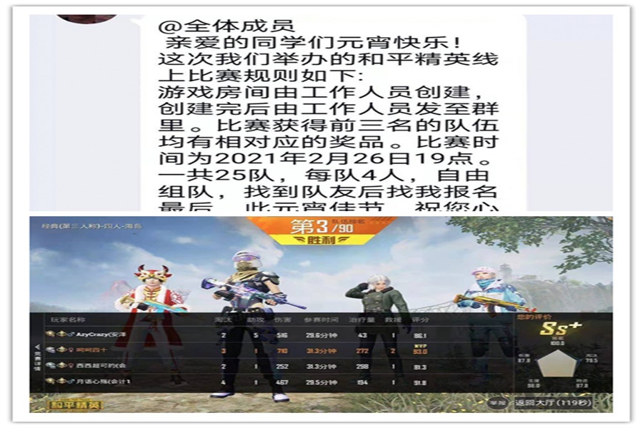 游戏类型也多种多样,斗地主、英雄联盟、王者荣耀、和平精英和篮球等等,此次的游戏比赛以男生为主力。为了能够得到更好的进行活动,同学们在几天之前就开始准备,在活动开始时,场面异常热闹,每个人脸上都洋溢着笑容,让同学们感受到了元宵节热闹的氛围。
