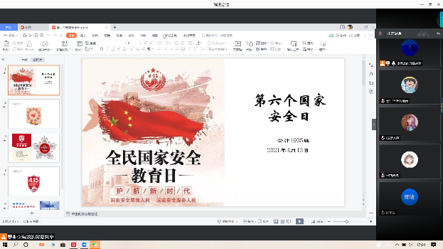 (财经团委 讯)为推动国家安全宣传教育深入开展,进一步增强党员的国家安全意识,2021年4月13日,财经学院开展了以“国家安全教育日,法制宣传进行时”为主题的线上会议,此次会议由财经学院党总支书记傅萍主持,财经学院全体党员参加了会议。