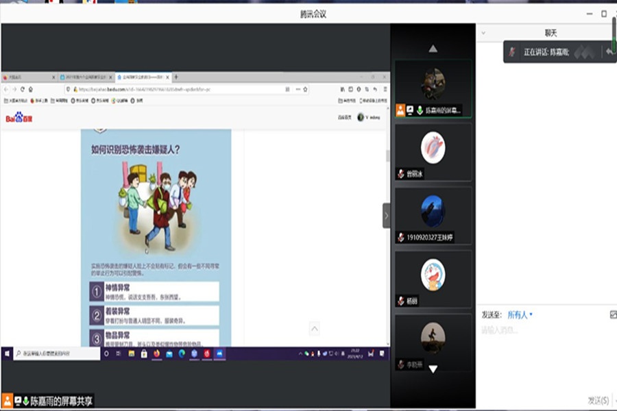 在第六个“全民国家安全教育日”来临之际,为增强同学们的安全防范意识,提高同学们的安全防御能力,全面普及安全教育常识,4月13日下午,会计1905班在腾讯会议举行了以“全民国家安全教育”为主题的主题班会。