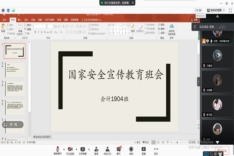 在第六个“全民国家安全教育日”来临之际,为增强同学们的安全防范意识,提高同学们的安全防御能力,全面普及安全教育常识,4月13日下午,会计1905班在腾讯会议举行了以“全民国家安全教育”为主题的主题班会。