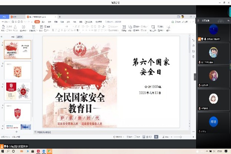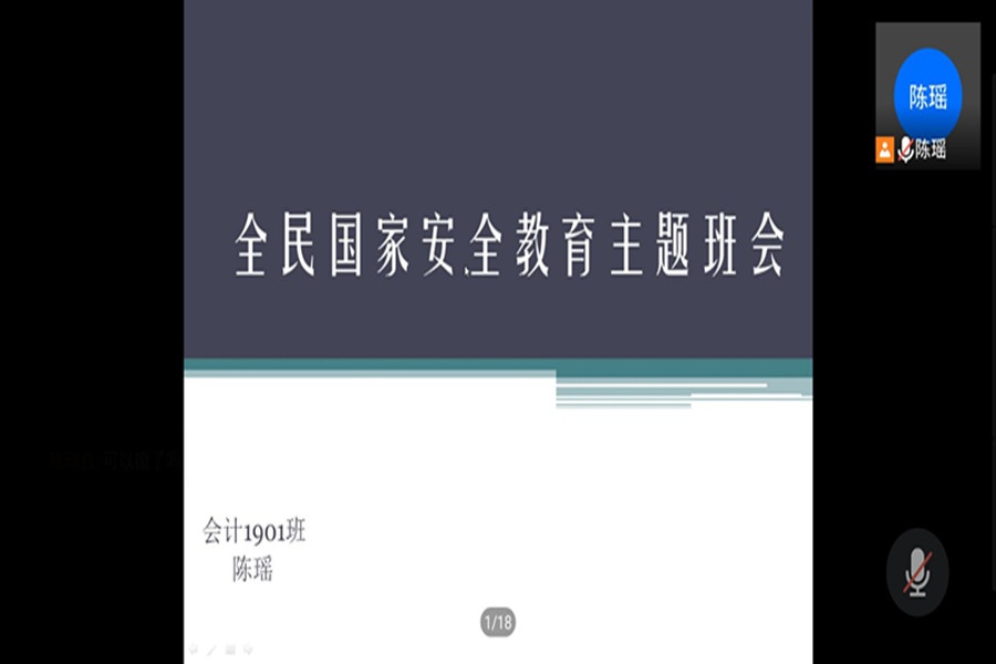 2021年4月15日是第六个全民国家安全教育日。为了响应国家号召,增强全民国家安全意识,会计1901班于4月12日十三点开展以践行总体国家安全观为主题的线上主题班会。