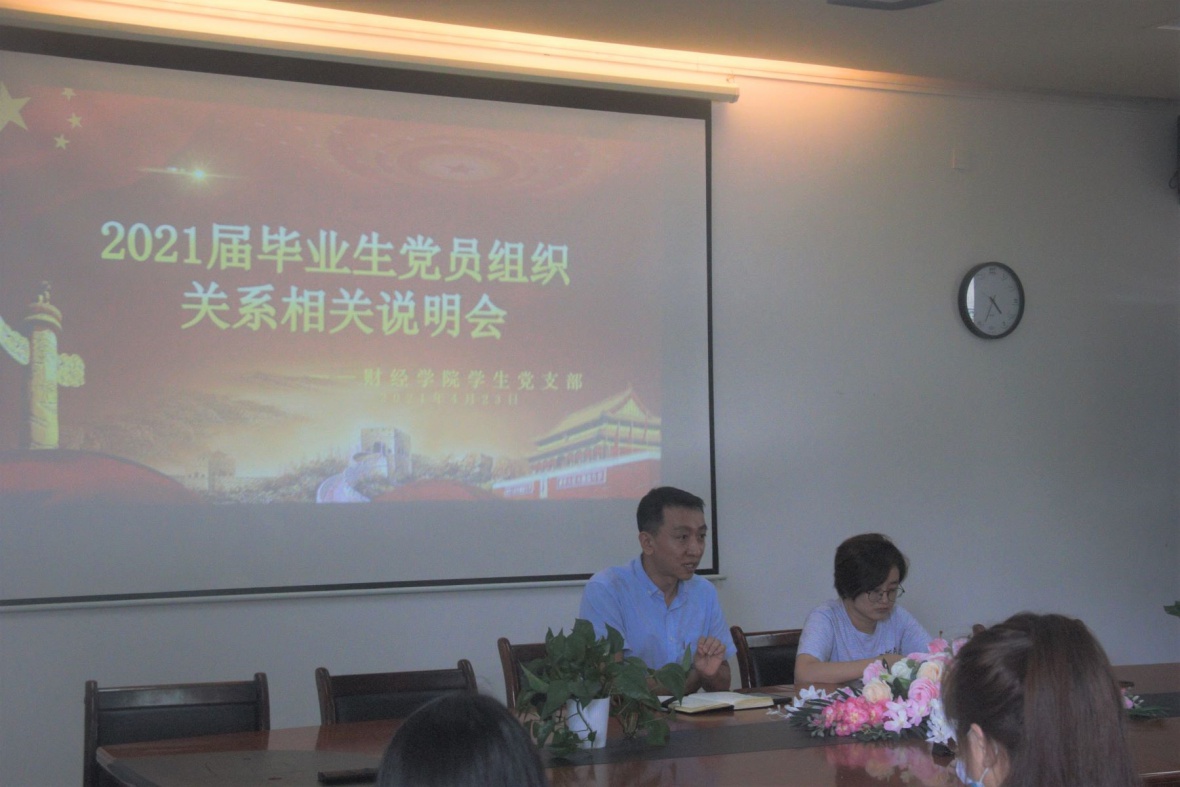 (财经团委 讯)2021年4月23日,社科楼四楼学院会议室召开了“2021届毕业生党员组织关系相关说明”工作会,财经学院团委书记曹瑞吉和团委副书记祝弘扬对学院的毕业生党员组织做出说明和指导,以确保毕业生们可以顺利完成党员组织关系转移。本次参会人员有财经团委书记曹瑞吉,团委副书记祝弘扬以及2021届的毕业生党员。