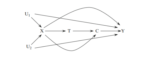 DAGs由三个元素组成:变量(节点,顶点),箭头(边(缘)),以及遗漏的箭头(missing arrows)。箭头表示变量与未来的顺序变量的对偶之间可能的定向的因果的结果。在C与Y之间的箭头意味着C至少作为总体的一个成员在Y上可以施加一个直接的因果性结果。遗漏箭头表示对于总体的每个成员的两个变量之间没有直接因果结果的强假设。(某个所谓的无结果的“强零”假设)。T与Y之间的遗漏箭头断言在Y上T的直接的因果结果的完全缺失。DAGs是非参数构造的:它们没有做关于变量(正态,泊松)分布,直接结果的泛函形式(线性的,非线性的,阶梯式的),或者因果效果量级的陈述。