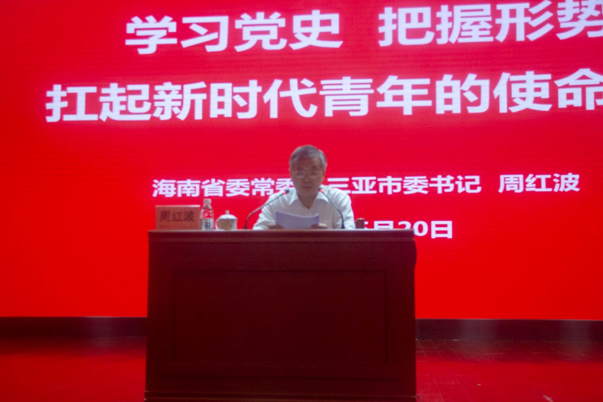 (财经团委 讯)为了让同学们学习中国共产党历史,扛起新时代的青年担当,让学生深刻感悟共产党人的初心和使命,2021年5月20日,我校于书山馆大报告厅开展了关于“学习党史,把握新形势,扛起新时代青年的使命担当”的专题党课。本次党课由海南省委常委、三亚市委书记周红波担任主讲人,三亚学院校长陆丹主持。