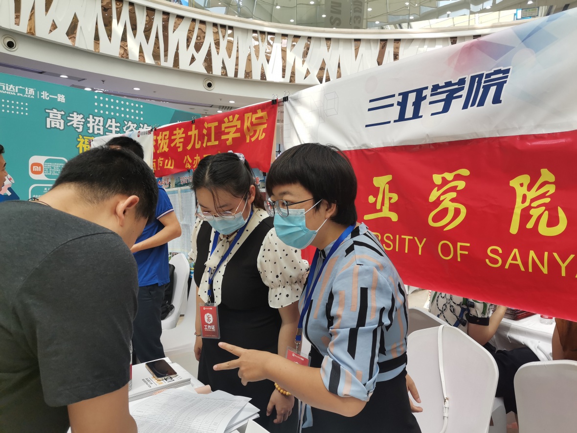 本次高招会三亚学院财经学院曹小杰老师和两位财经学院的学生早早地来到了现场,在高校展位上摆好招生咨询图册,静待高考生们过来咨询。
