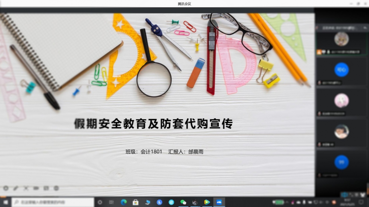 暑假将至,为了保证暑假期间学生的人身和财产安全,维护学校的和谐稳定,让学生度过一个欢乐祥和、安全有序的假期,根据省教育厅和学校有关要求,会计1801班在班长邰晨雨同学的组织下在腾讯会议开展了主题班会。主要对学生暑假期间的安全教育工作、以及严厉打击离岛免税套代购工作做了进一步的宣传。