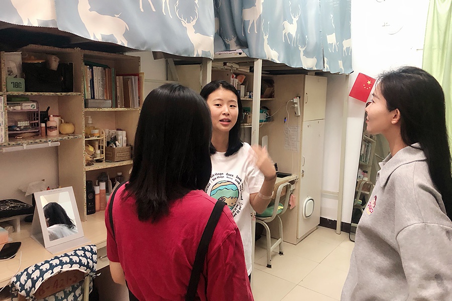 2021年10月13日,张誉丹老师走访宿舍,耐心讲解台风来临前:首先要准备食品物品,然后要将阳台上易坠物品移走,最后一定要注意检查电源火源。台风来临时:要密切关注台风,时刻检查室内电源,尽量员避免外出。台风经过后:要及时检查和做好卫生,清洁环境。