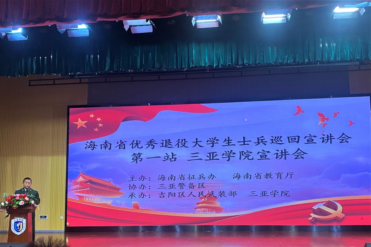 为了贯彻落实好省、市军区及武装部开展优秀退役大学生士兵高校巡回宣讲活动的工作安排,更好的展示海南省优秀退役大学生风采,点燃同学们的参军报国热情,我校于2021年11月26日(星期五),在图书馆(书山馆)大报告厅开展海南省优秀退役大学生士兵巡回宣讲会。本次宣讲会由海南大学黄海宁副教授主持完成。