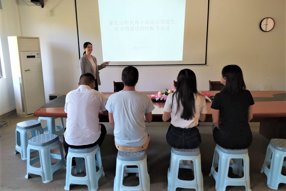 为了更好地与各专业老师进行学术交流,2021年11月30号在社科楼423会议室,李娟博士进行了题为《量化分析视角下海南自贸港生态文明建设的短板及改进》的学术讲座。