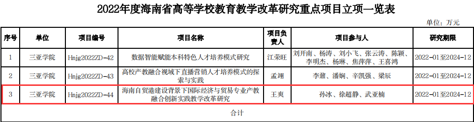 应用经济系的《国际贸易理论与实务》课程团队获批2022年度海南省高等学校教育教学改革重点项目一项,团队成员为:王爽博士、孙冰副教授、徐超静副教授、武亚楠讲师。团队将围绕“国际经济与贸易专业”的产教融合展开具体研究工作。
