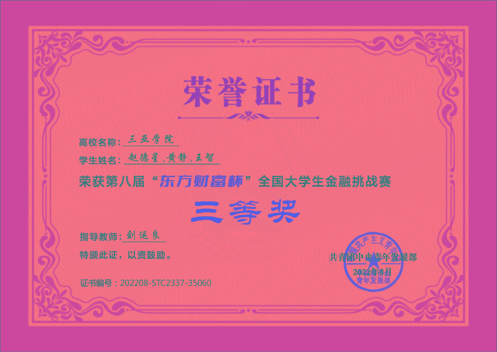 在今年八月落下帷幕的第八届“东方财富杯”全国大学生金融精英挑战赛中,我院经济与金融专业捷报频传。“东方财富杯”全国大学生金融挑战赛是面向全国大学生群体打造的具有高知名度、高含金量及广泛社会影响力的金融创新实践大赛,在省赛阶段,我院多支队伍荣获省级二等奖、省级三等奖,在国赛阶段,我院队伍再接再厉,荣获三项国家三等奖。