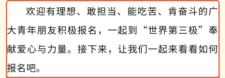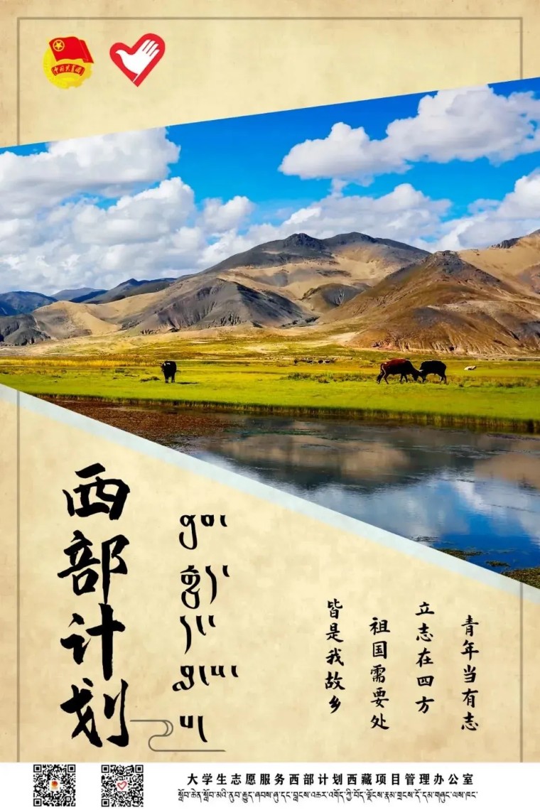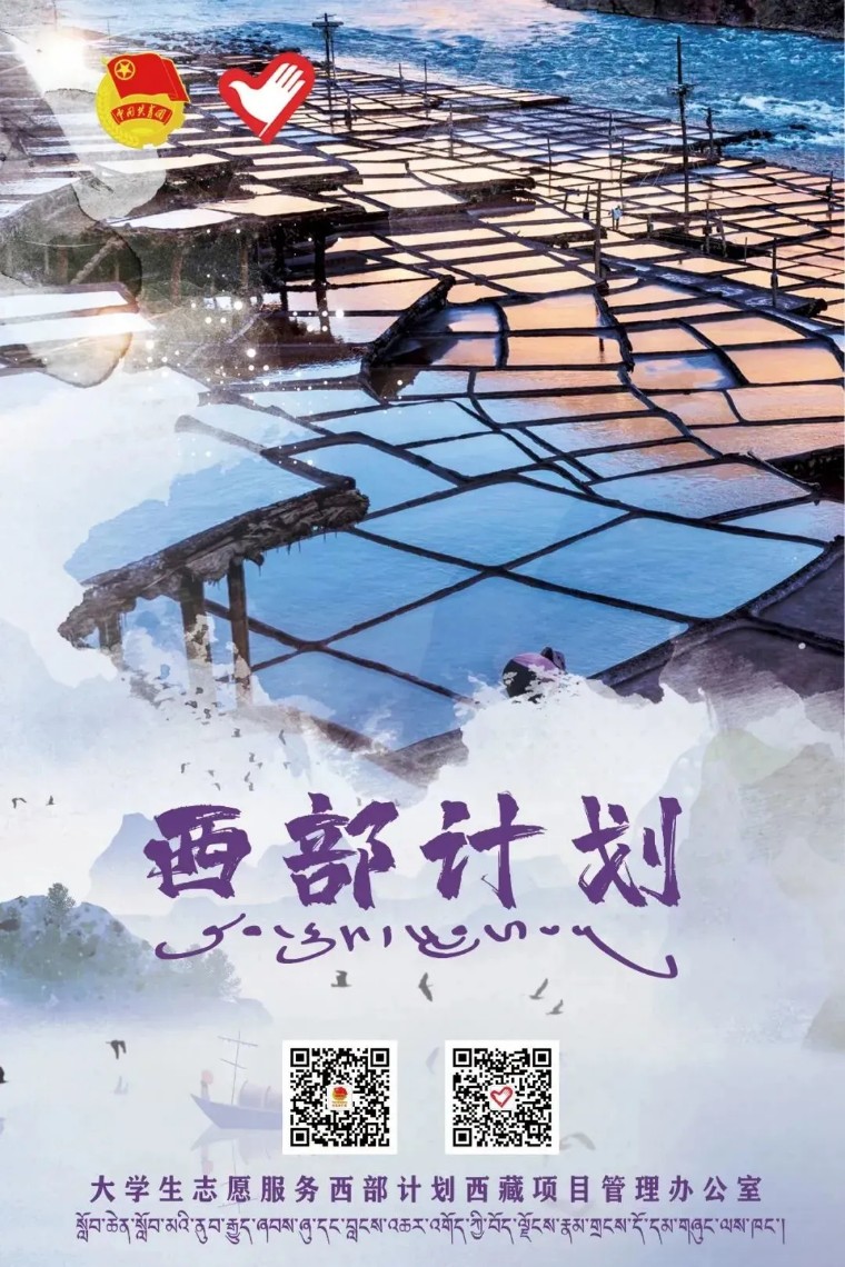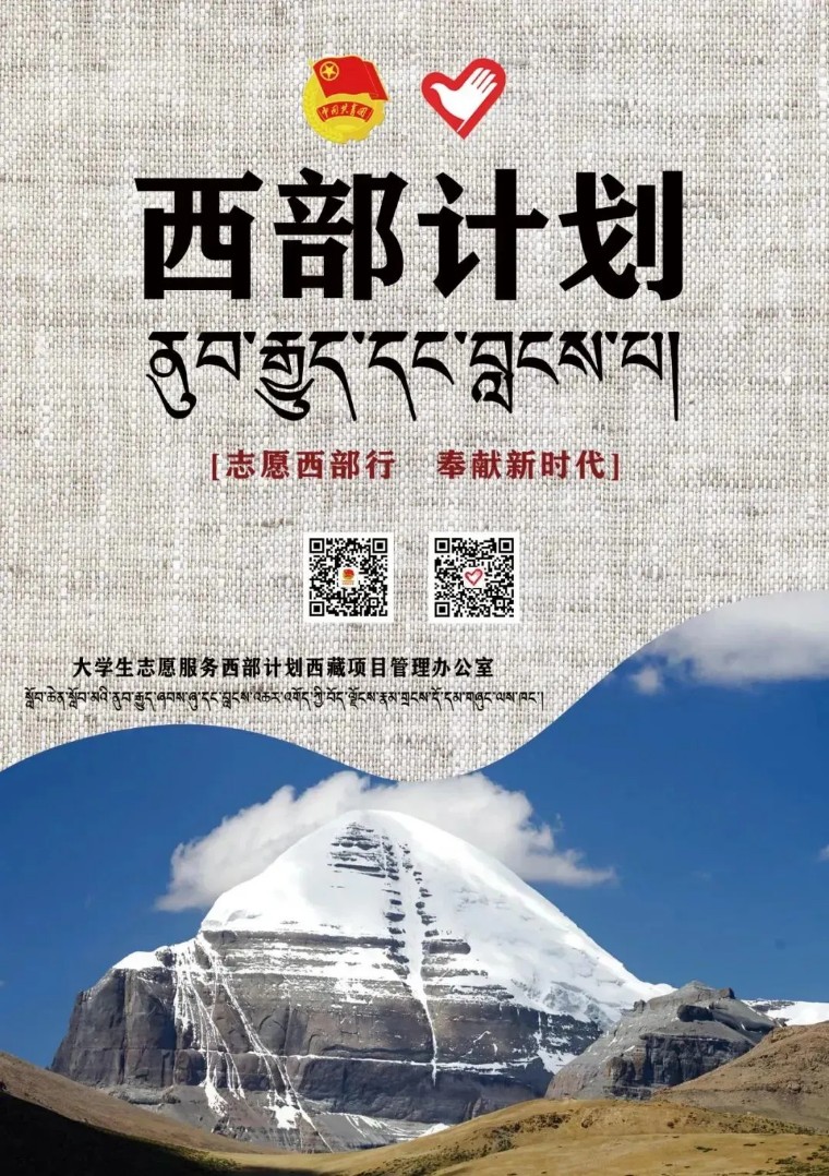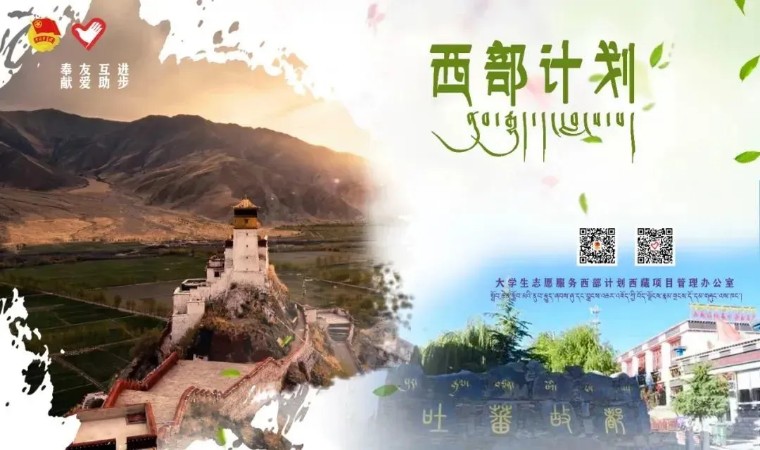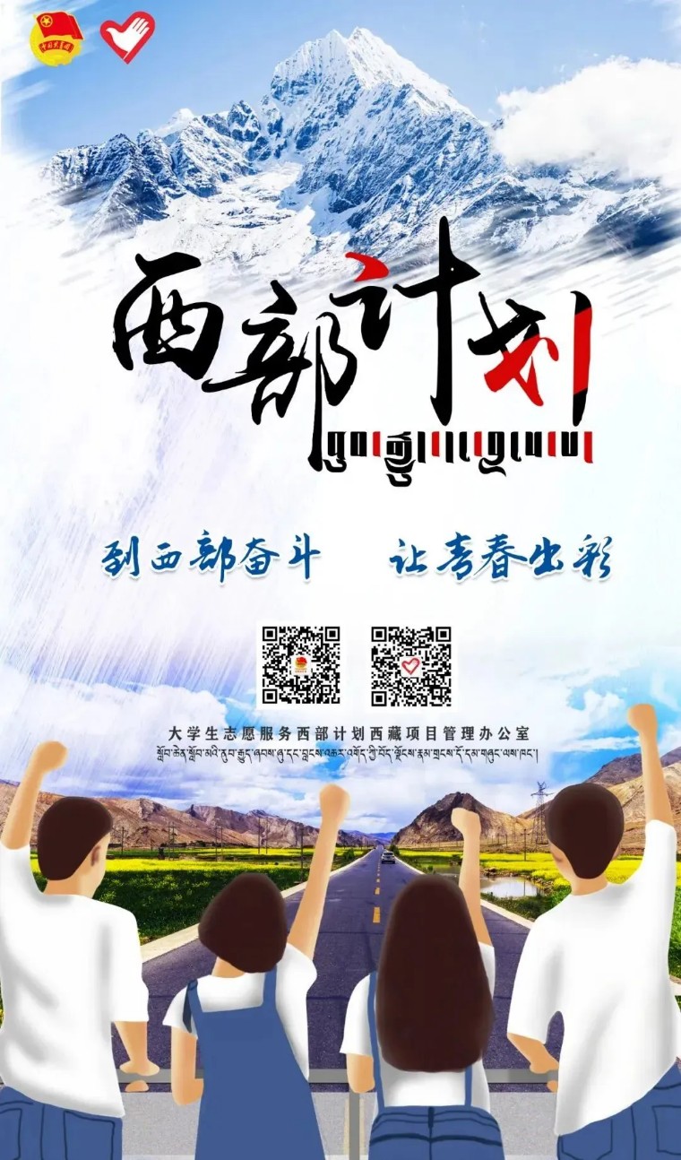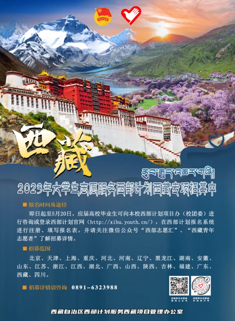 即日起至5月20日,2023年普通高等学校应届毕业生或在读研究生,可通过微信公众号“西部志愿汇”(菜单栏中的“我要报名”)或登录西部计划官网,在西部计划报名系统中进行注册报名。 西部计划官网 http://xibu.youth.cn 大学生志愿服务西部计划自2003年实施以来,先后有20批11700余名西部计划志愿者来到西藏,投身基层,艰苦奋斗,为西藏经济社会发展贡献出青春力量。3800余名西部计划志愿者在服务期满后,选择扎根西藏就业创业,西藏经济社会发展的成就中汇聚凝结着西部计划服务西藏专项志愿者的一份耕耘、一份付出。 西藏位于我国的西南边陲,平均海拔在4000米以上,境内海拔超过7000米的高峰有50多座,其中8000米以上的有11座,素有“世界屋脊”和“世界第三极”之称。这里地域辽(区)其中近90%的县区有西部计划志愿者。 美好生活 幸福拉萨欢迎你们! 世界之巅 吉祥日喀则欢迎你们! 藏源山南欢迎你们! 人间净地 醉美林芝欢迎你们! 传奇昌都 卓卓康巴欢迎你们! 极地那曲欢迎你们! 藏西秘境 天上阿里欢迎你们!
