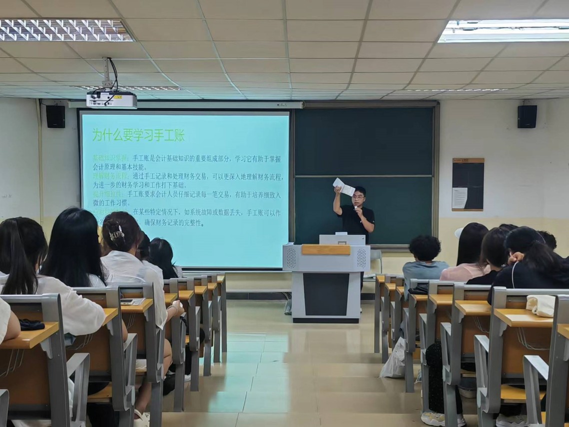 在会上,程都老师分享了宝贵的获奖经验,为我院学子提供了有益的借鉴与参考。程都老师指出,扎实的专业知识是基石,实践操作能力则是通向胜利的关键路径,团队协作是成功的重要因素,良好的心态也不可或缺。他表示,在掌握理论知识后,积极参与模拟会计业务操作、使用智能财务软件进行账务处理至关重要,从简单的记账凭证编制到复杂的财务分析报告撰写,每一个环节都需要反复打磨,注重提高操作的熟练度和准确性。