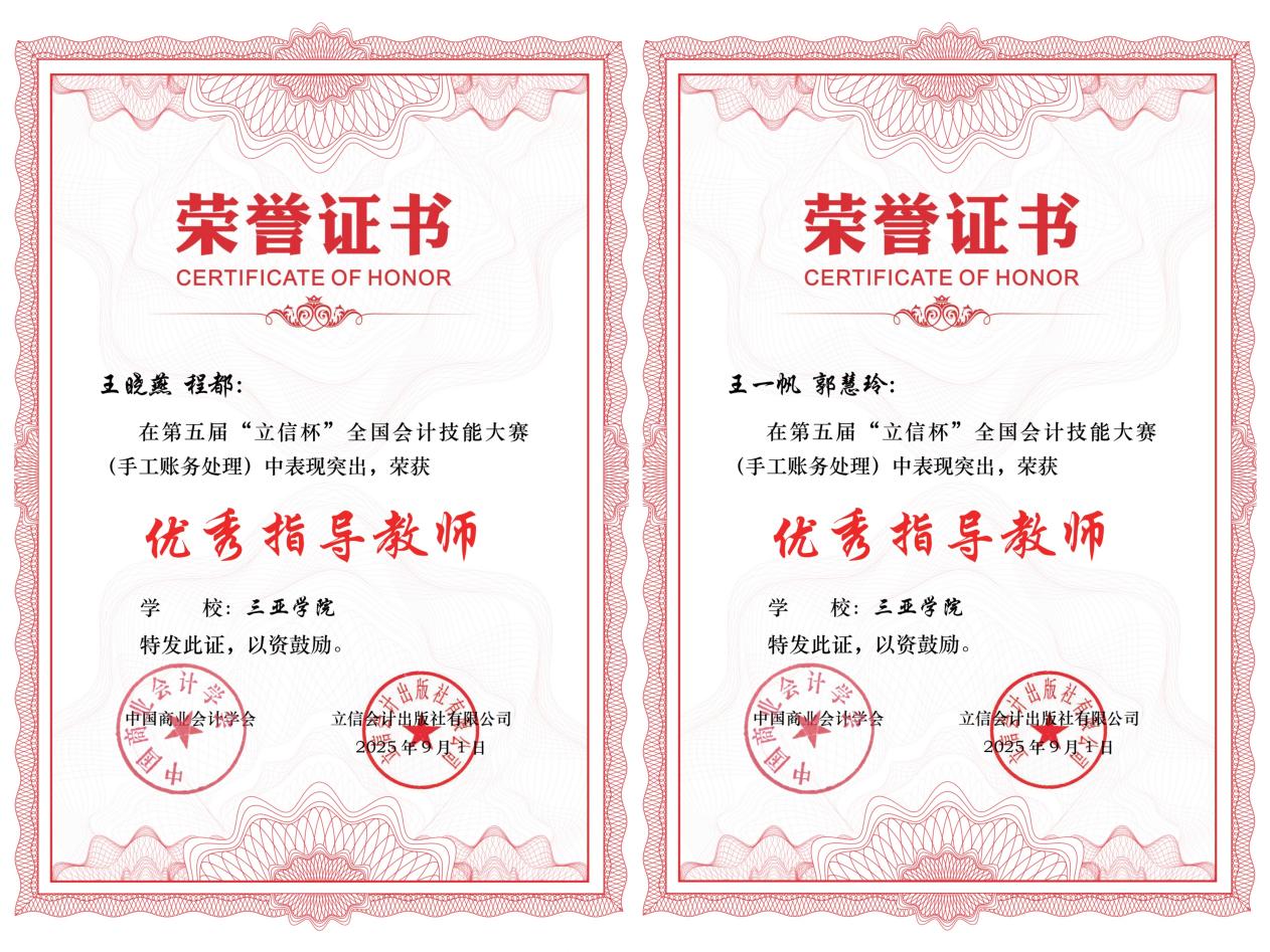 2025年9月,由中国商业会计学会主办、立信会计出版社承办的第五届“立信杯”全国会计技能大赛(手工账务处理)评选结果正式揭晓。我院5组参赛队伍全部入围决赛并斩获佳绩:翁若桐、吴霞、王蕊荣获“特等奖”,王桂娴、陈雅丽荣获“一等奖”,崔书仪、于鹏菊荣获“二等奖”,王亚洁、张燕磊、任静和肖倩、郑庆强荣获“三等奖”;王晓燕老师、程都老师和王一帆老师、郭慧玲老师获评“优秀指导老师”;三亚学院获评“优秀组织奖”,充分展现了我院在会计人才培养领域的扎实功底与卓越成效。