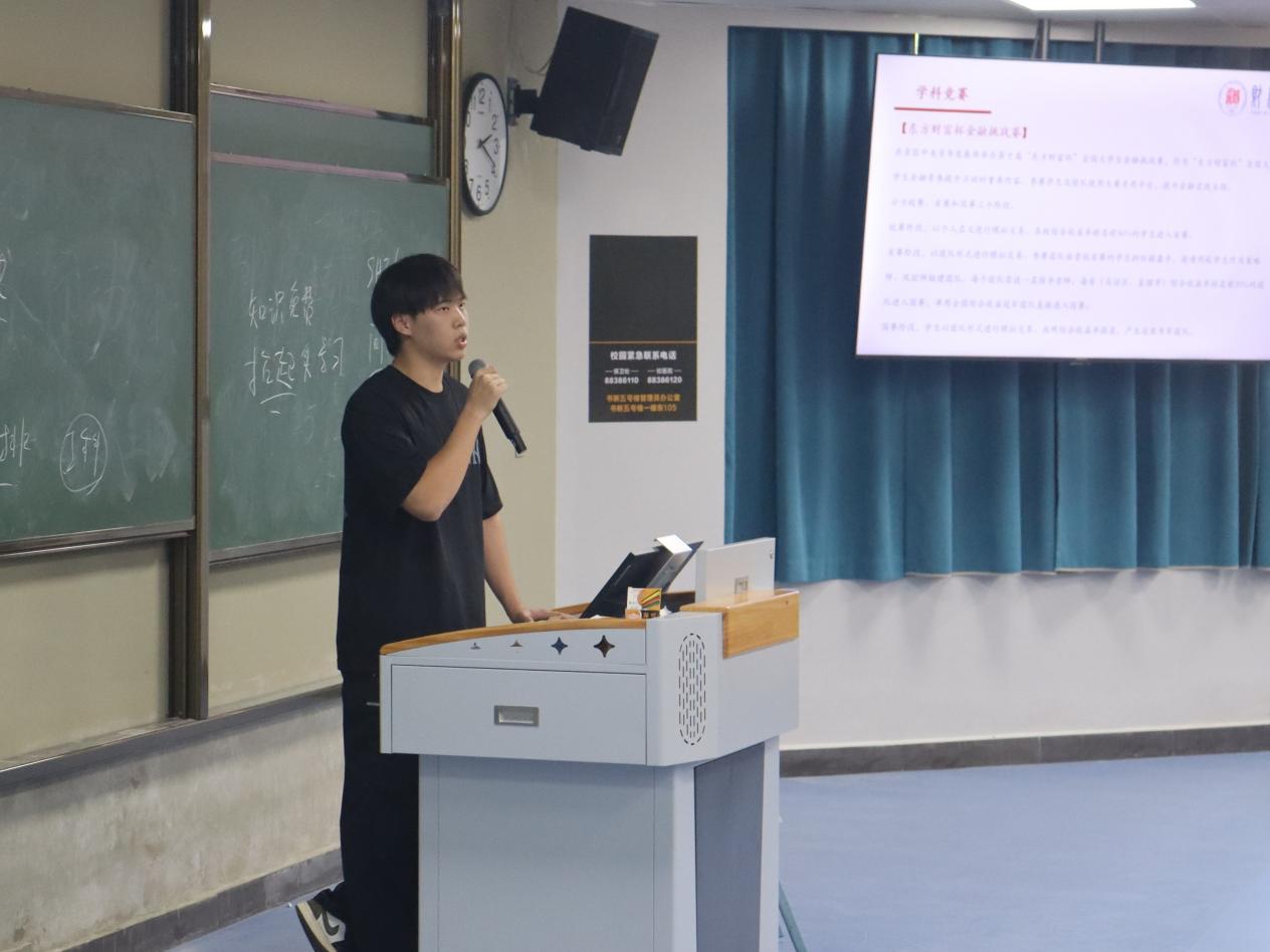 吴锡蕾同学重点介绍了推优入党、入团细则,还贴心地分享了大学四年不同阶段的考证、考级规划,为新生制定了清晰的考证路线图;林宇迪同学围绕评奖评优模块,为新生详细介绍了国家奖学金等各级各类奖学金的申请条件及评选标准,还鼓励新生多参与学科竞赛,呼吁大家以积极的态度、扎实的成绩去争取荣誉;廖晨曦同学分享了考公考研的学习方法,提醒新生在大学期间要养成良好的学习习惯,制定学习计划,勤做笔记,多去图书馆,脚踏实地朝着目标前进。