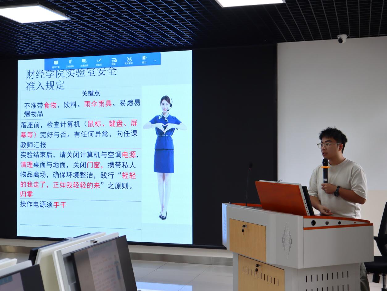 培训伊始,程都老师围绕“财经学院实验室安全准入规定”展开详细讲解。明确强调不准携带食物、饮料、雨伞雨具及易燃易爆物品进入实验室;学生落座前,需仔细检查计算机鼠标、键盘、屏幕等设备是否完好,若有异常要第一时间向任课教师汇报;实验结束后,必须关闭计算机与空调电源,认真清理桌面与地面,关闭门窗并携带私人物品离场,践行“轻轻的我走了,正如我轻轻的来”的“归零”原则,同时操作电源时须保持手部干燥,这些规定从物品携带、设备检查到离场规范,构建了实验室准入的基本准则。