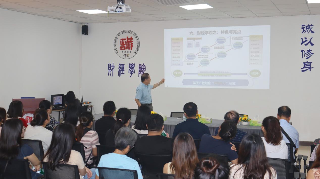 随后,张涛院长聚焦财经学院的改革与发展,详细介绍了学院的专业设置、师资队伍建设、课程体系改革、实践教学成果及科研方向等内容。他重点提及学院在培养应用型财经人才方面的探索与实践,强调学院始终以市场需求为导向,不断深化产教融合,致力于提升学生的专业素养与实践能力。