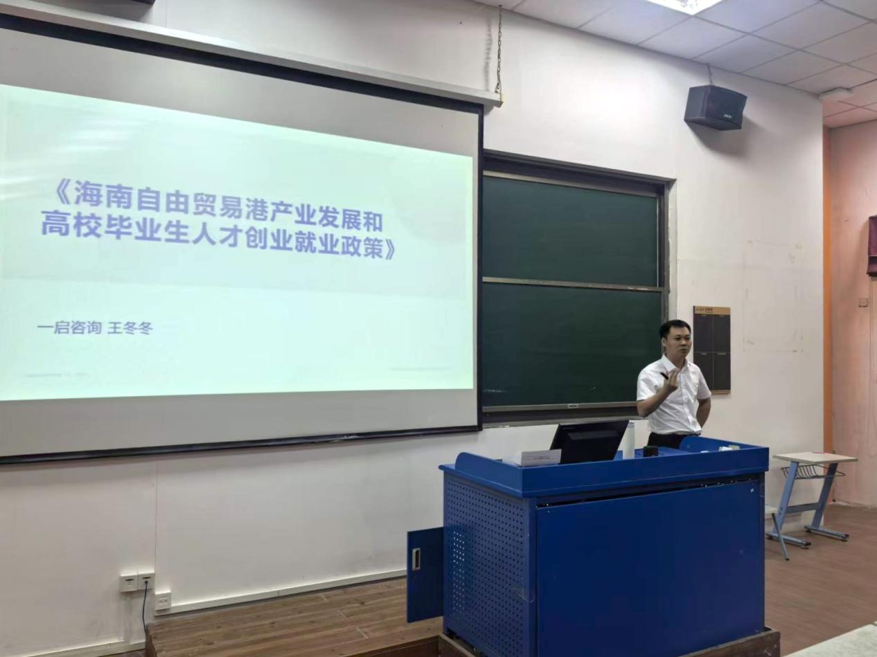讲座中,王冬冬导师结合财经专业特点,围绕海南自贸港建设背景下的就业创业政策展开详细解读。他从政策出台的背景、具体条款的适用范围,到政策对财经类学生就业创业的利好与机遇,进行了深入浅出的讲解。针对财经学子关心的创业补贴、税收优惠、人才引进等政策细节,王冬冬导师通过实际案例逐一剖析,让同学们对政策有了更直观、更透彻的理解。