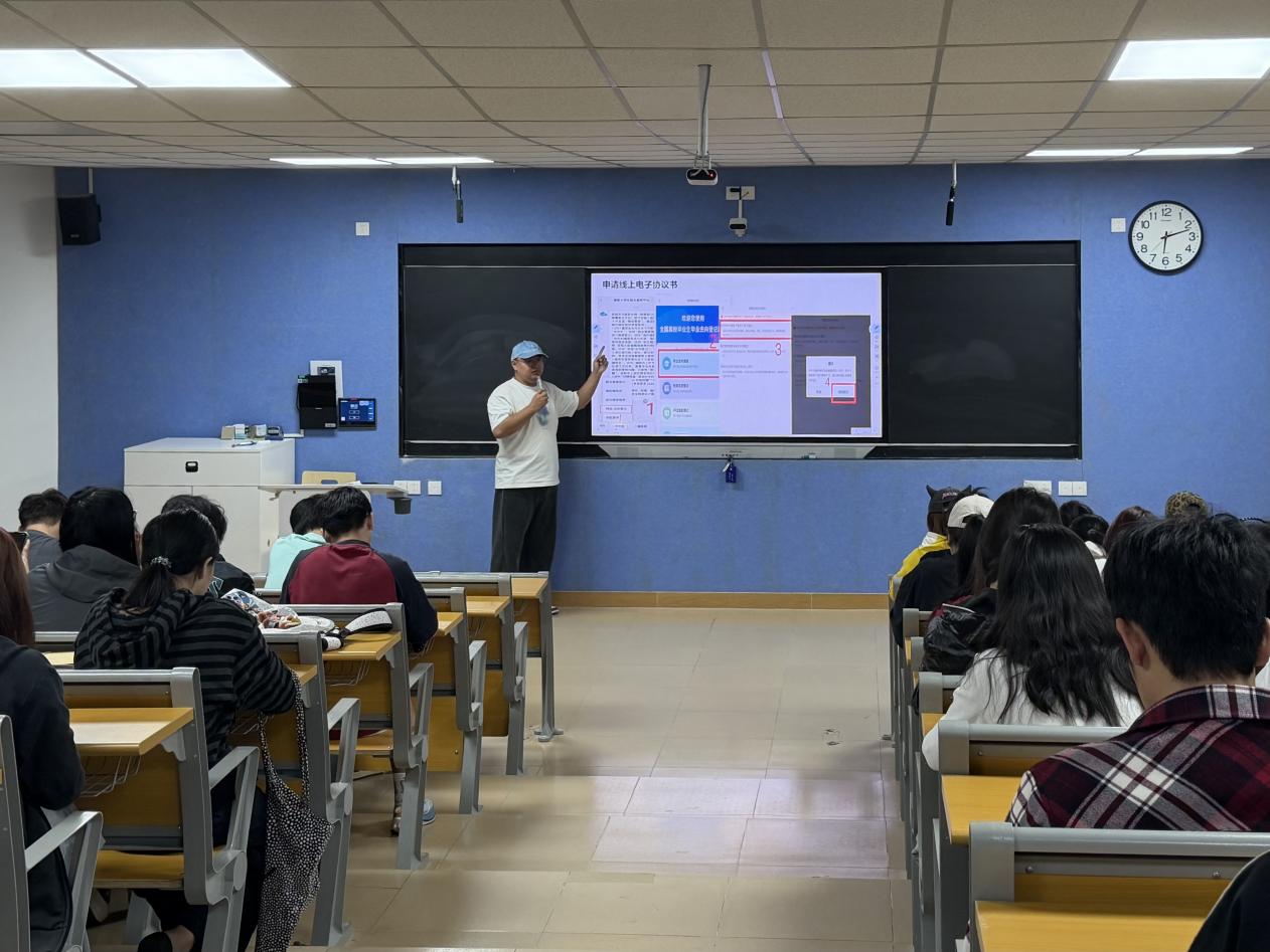 在就业手续办理指导环节,思想导师重点拆解线上操作流程,让复杂手续“简单化”。从“国家大学生就业服务平台”注册登录、毕业去向分类填报(就业创业、升学深造、灵活就业等),到电子就业协议(三方协议)的网签申请、用人单位邀约响应、学校审核确认等步骤,思想导师通过屏幕演示、流程图示等直观方式,详解每一项操作的注意事项。针对线下签约情况,特别提醒同学们及时在系统中完成纸质协议登记,明确违约金约定、福利待遇备注等关键条款,维护自身合法权益。