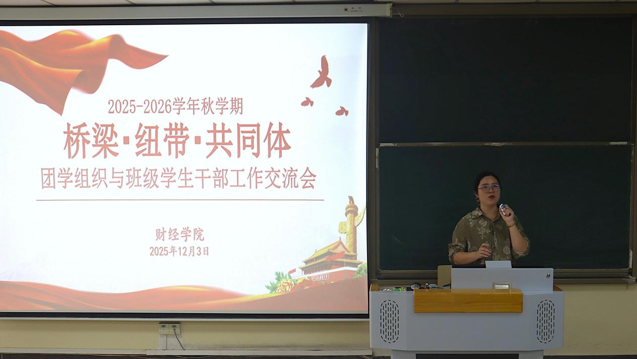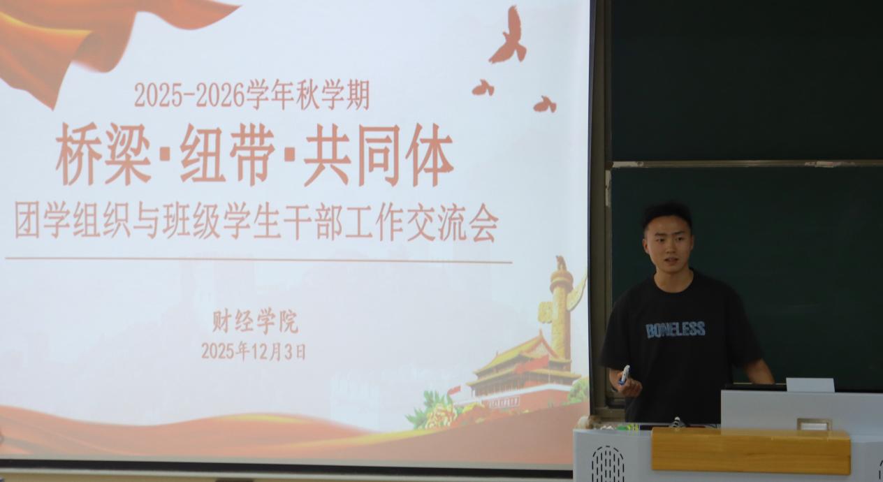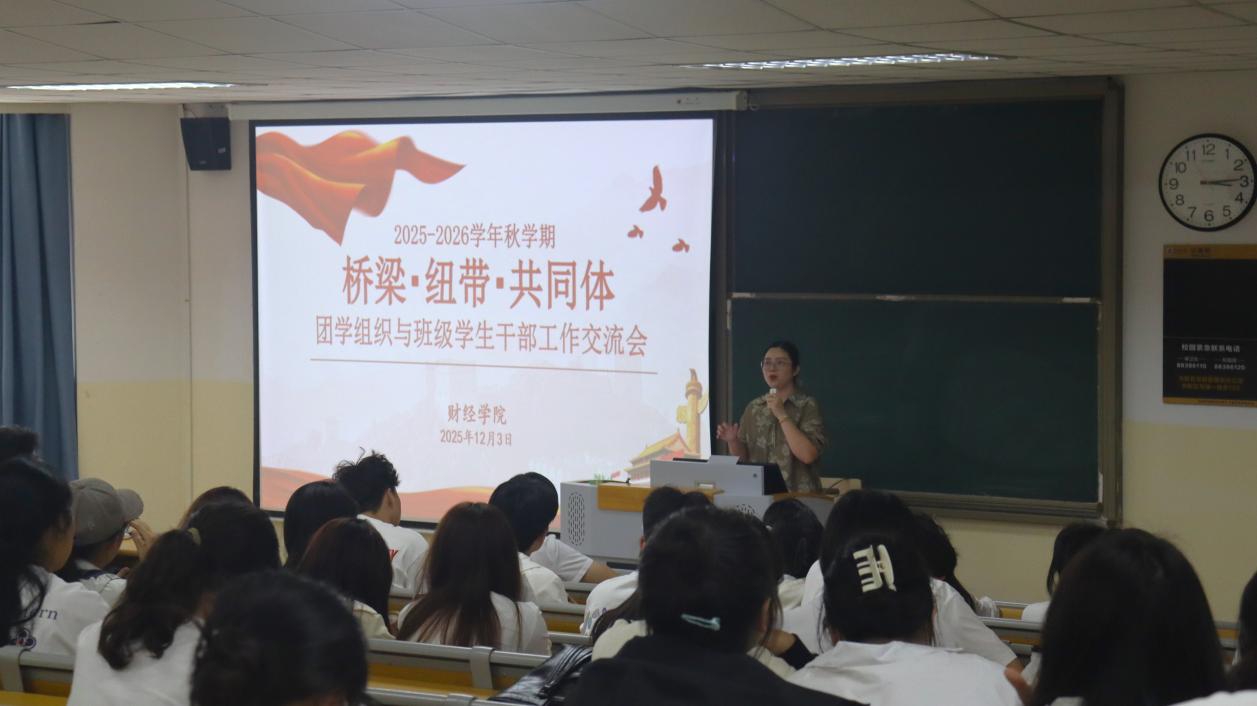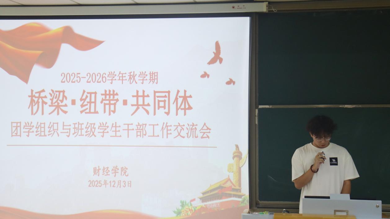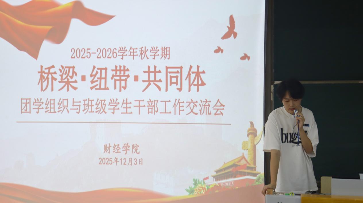 为深化团学组织与班级学生干部的协同协作,进一步夯实学院学生工作基础,提升学生工作质效,12月3日下午,财经学院于书新5号楼5西303教室顺利召开以“桥梁·纽带·共同体”为主题的团学组织与班级学生干部工作交流会。学院团委副书记张娜出席会议,各团学组织骨干及大一、大二班委代表齐聚一堂,共话协作、共商发展。