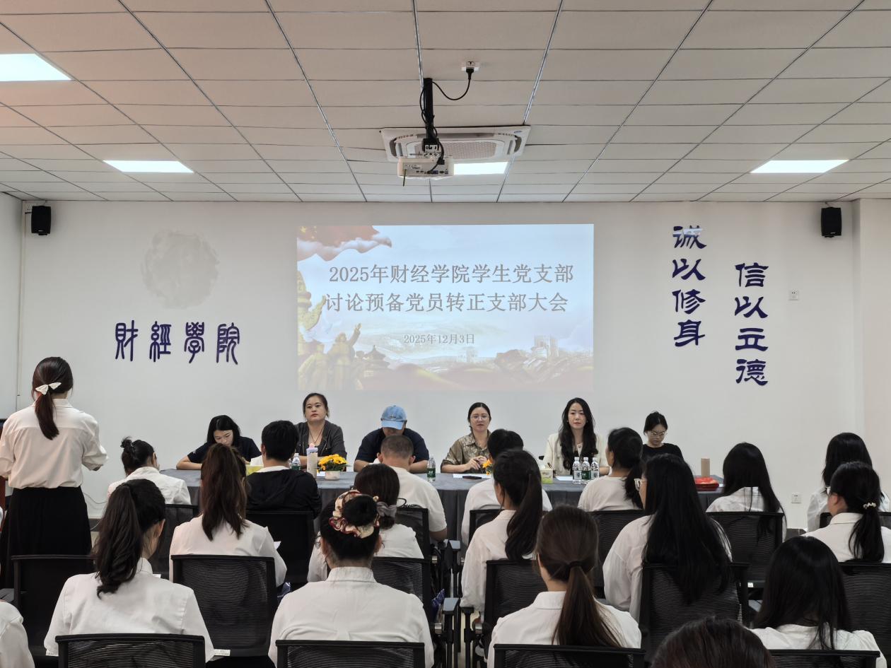 12月3日,财经学院学生党支部在书新3号楼416会议室召开2025年下半年讨论预备党员转正支部大会,支部书记张娜、组织委员王微、宣传委员兼纪检委员鞠岳坤,及思想导师于铭、张淑怡、许梦缘出席会议,支部书记张娜主持大会,支部正式党员及本次申请转正的预备党员参与会议。