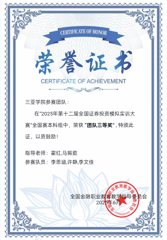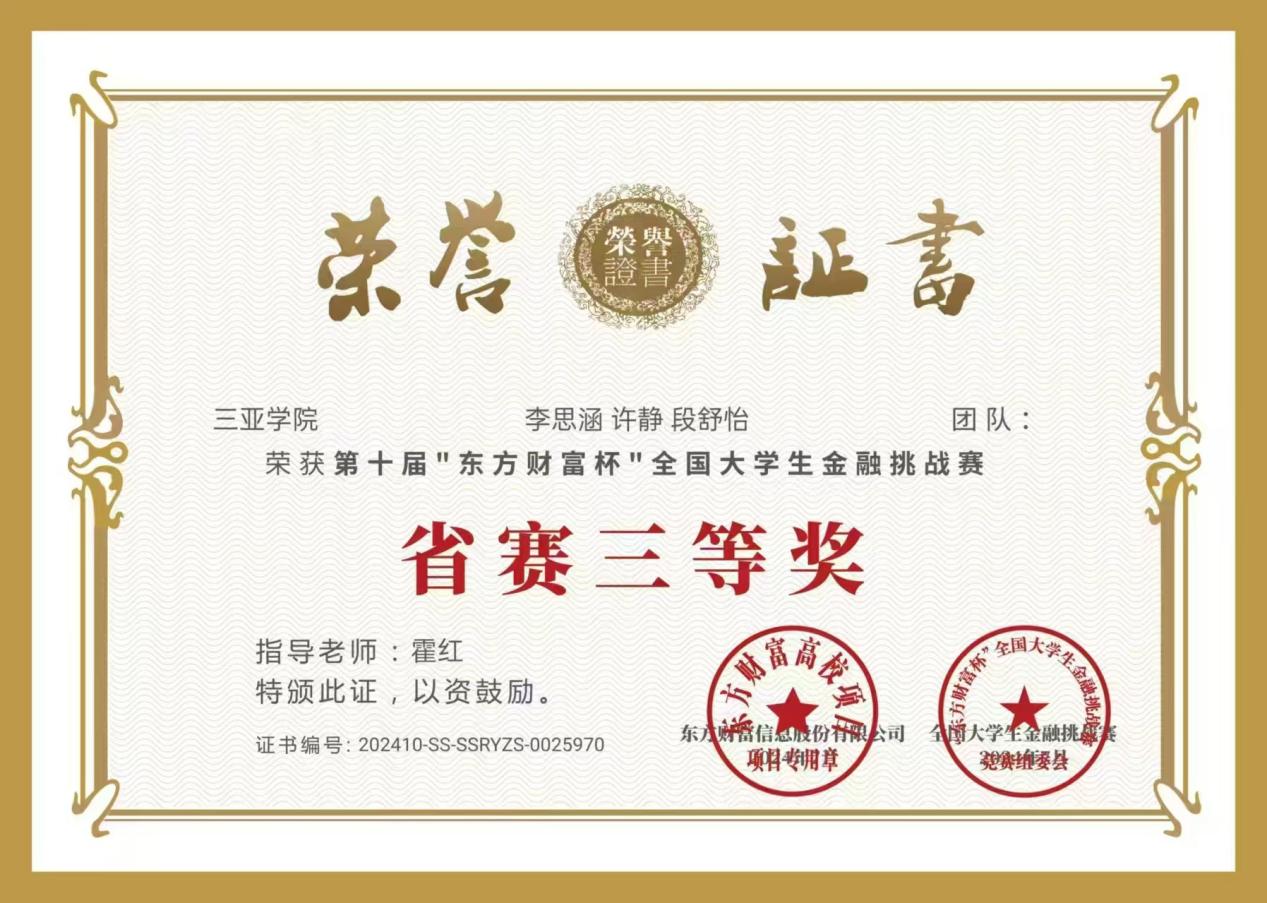 她是专业成绩稳居榜首、核心课程近乎满分的“学霸”,也是驰骋学科竞赛赛场、奔走志愿服务一线的“行动派”;她手握多项国家级、省级竞赛奖项,凭专业实力崭露头角,更在知名企业实习岗位上展现出扎实的专业素养与高效执行力。三亚学院财经学院财务管理专业学子李思涵,以专业知识锚定成长方向,用实践行动诠释青年担当,荣获2024-2025学年度国家奖学金。