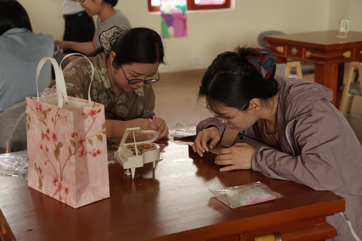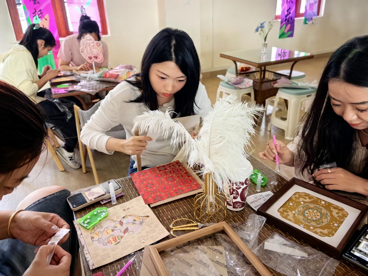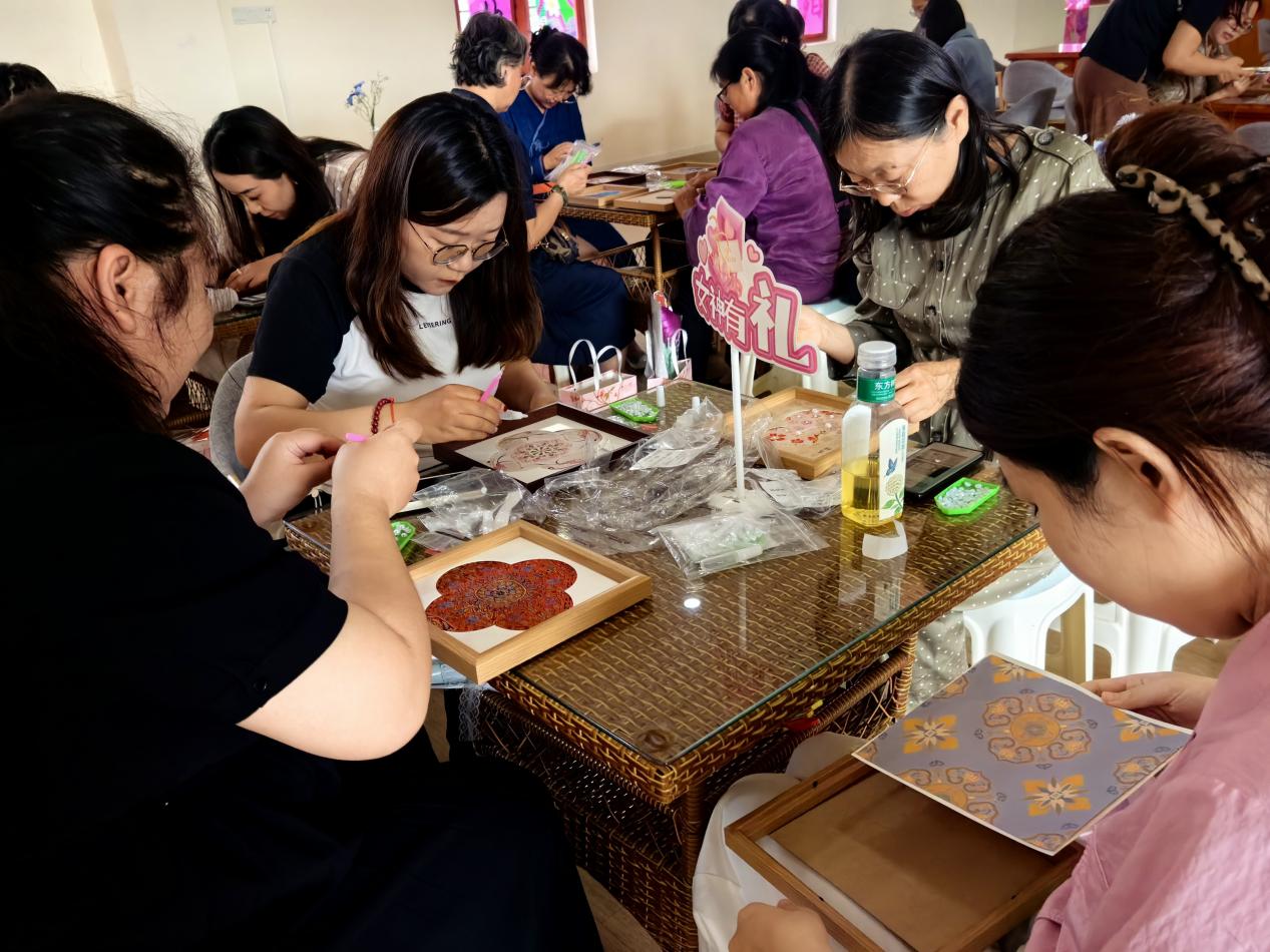 宋锦珍珠画DIY现场热闹而有序,女教职工们兴致盎然、巧手创作,挑选精致的宋锦纹样、搭配莹润的珍珠,在一针一线、一粘一贴间勾勒美好,将对生活的热爱与对美的理解融入作品之中,彼此交流创作心得、分享手工乐趣,现场暖意融融、笑语盈盈。