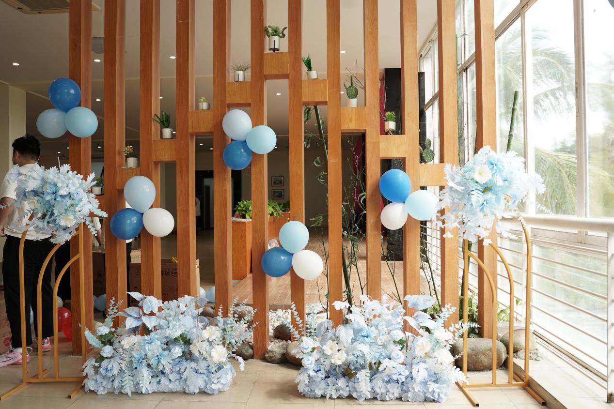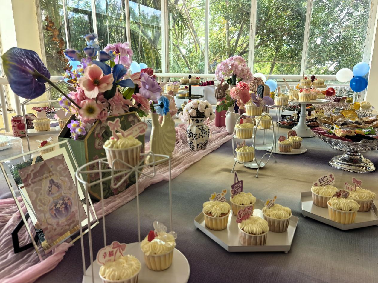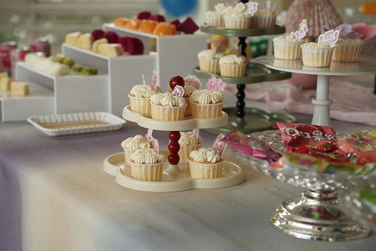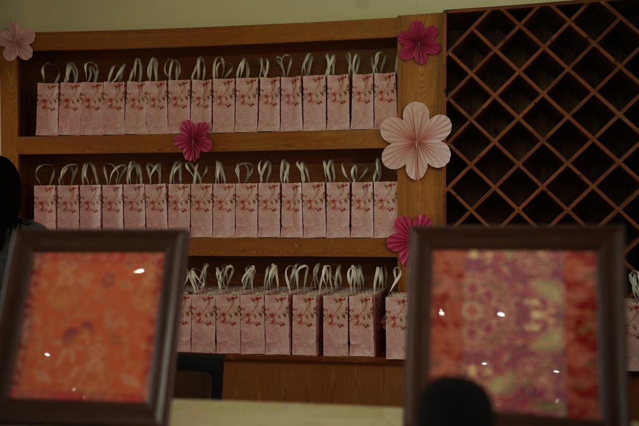 活动现场布置得温馨雅致,粉色主题横幅醒目悬挂、直抵人心,缤纷气球与蓝白花艺相映成趣,精致的甜品台香气四溢,处处洋溢着温馨美好的节日氛围。本次宋锦珍珠画DIY活动,将传统非遗美学与手工创作相结合,为女教职工们打造了一场兼具趣味与美感的节日体验。