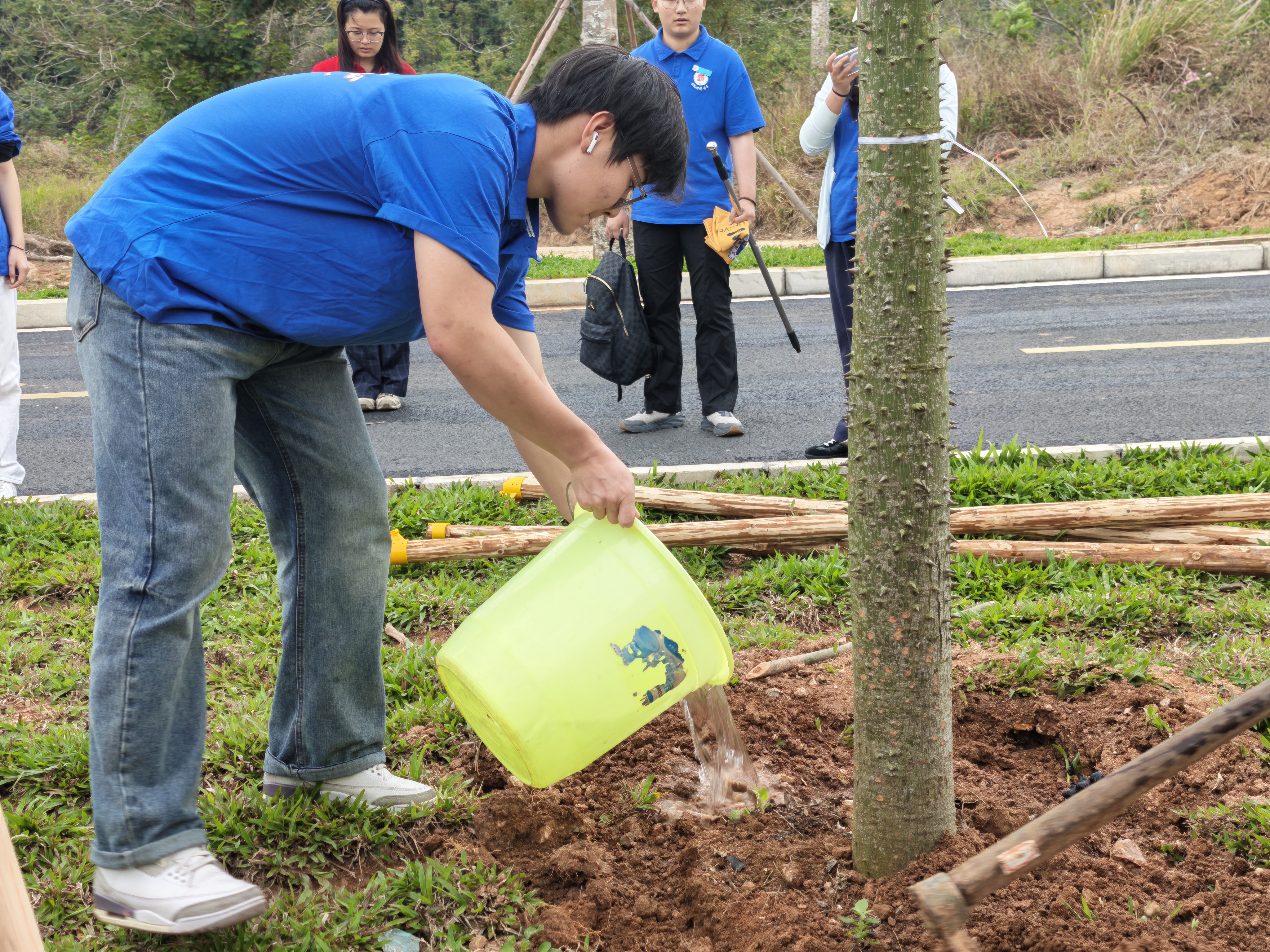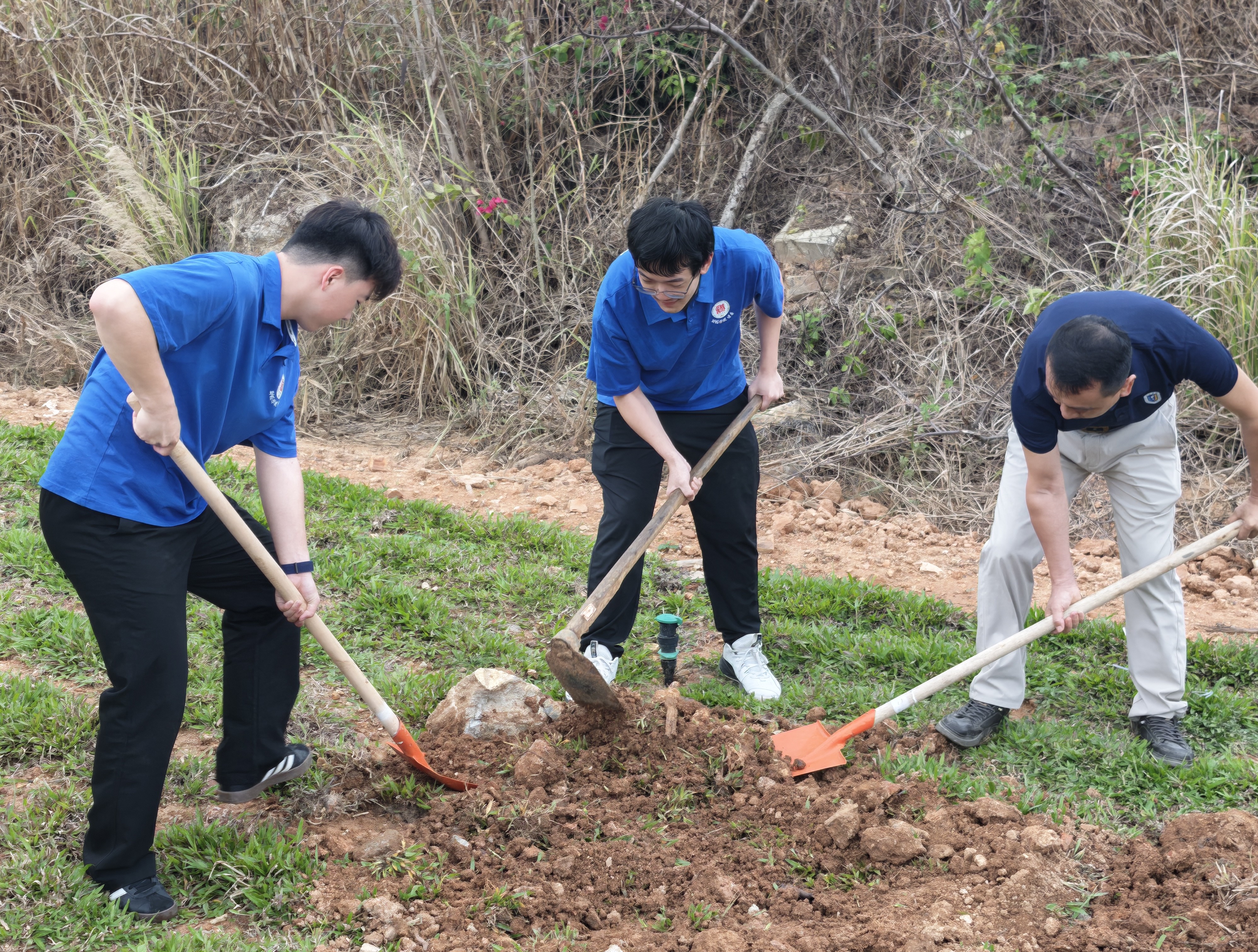 活动现场,师生们热情高涨、分工协作,配合十分默契。挥锹铲土、扶正苗株、填土踩实、提水浇灌,每一个步骤都认真细致、一丝不苟,繁忙的身影勾勒出春日里最美的劳动画卷,现场一派热火朝天的盎然景象。